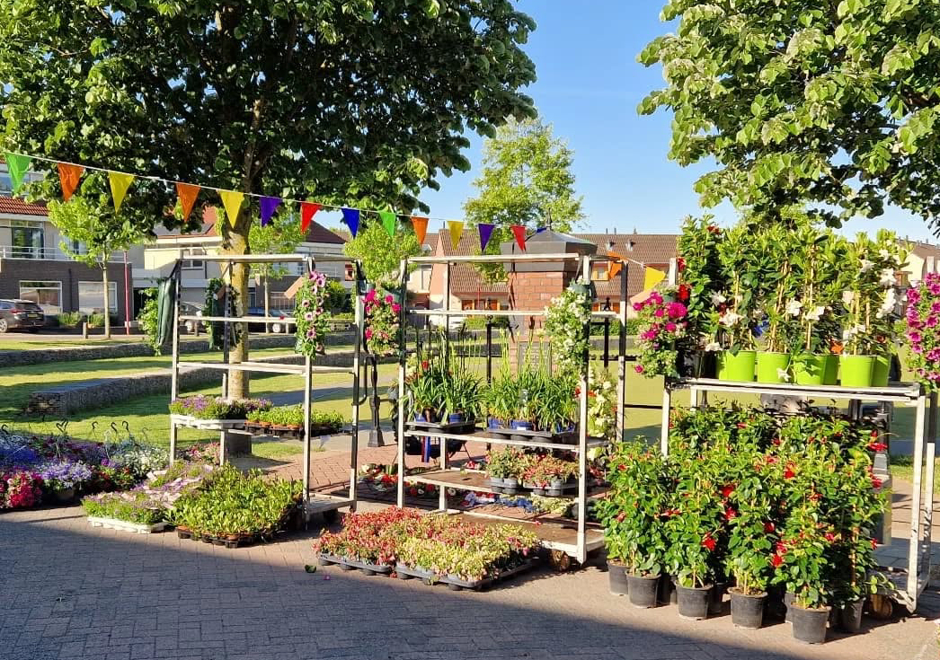 De keuze bestond uit een groot assortiment plantjes, van geraniums tot petunia’s en vlijtige liesjes en niet te vergeten de potgrond.